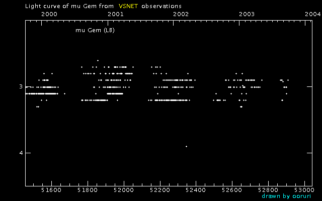 Light Curve of mu Gem (mu Geminorum) from VSNET reports