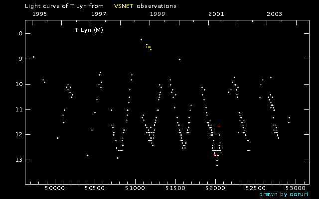 Light Curve of T Lyn (T Lyncis) from VSNET reports