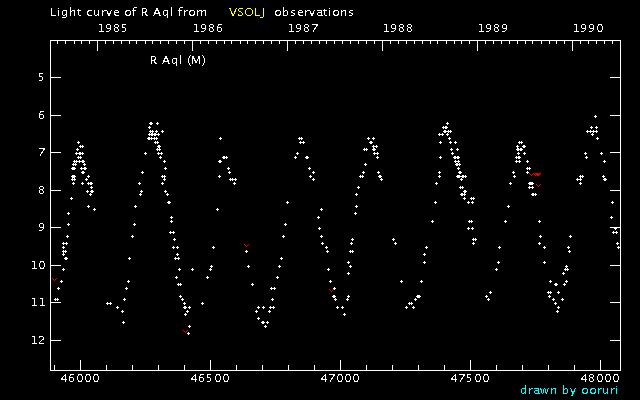 Light Curve of R Aql (R Aquilae) from the VSOLJ database (1985-1989)