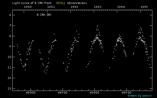 Light Curve of R CMi (R Canis Minoris) from the VSOLJ database (1990-1995)
