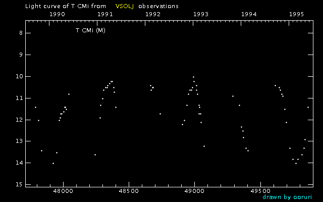 Light Curve of T CMi (T Canis Minoris) from the VSOLJ database (1990-1995)